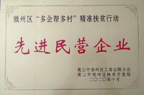 2020年10月13日,區(qū)工商聯(lián)、區(qū)扶貧開發(fā)局聯(lián)合在呈坎鎮(zhèn)容溪碼頭農(nóng)產(chǎn)品展銷會(huì)上舉行“多企幫多村”精準(zhǔn)扶貧行動(dòng)先進(jìn)民營(yíng)企業(yè)表彰大會(huì)。包括我公司在內(nèi),徽州區(qū)共有20家企業(yè)獲此殊榮。